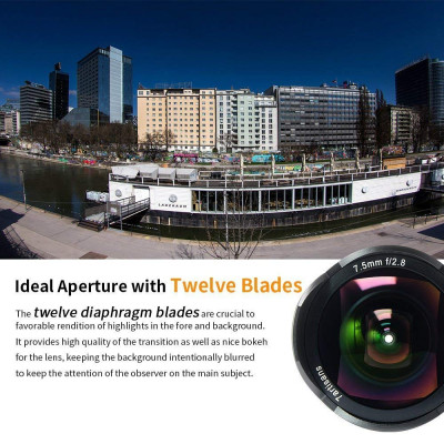 Il 7artisans 7.5mm f/2.8 Fisheye è un obiettivo Fisheye per formato APS-C. La messa a fuoco avviene tramite Manual Focus, non è presente stabilizzazione d'immagine. Angolo di campo 180°. Eccellente contrasto grande nitidezza. Ideale per le riprese in interni. Paraluce incorporato. Tappi ant/post di corredo.