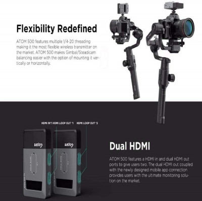 Atom 500 presenta più attacchi 1/4-20 che lo rendono il trasmettitore wireless più flessibile sul mercato. Atom 500 semplifica il bilanciamento di Gimbal/Steadycam con la possibilità di montarlo verticalmente o orizzontalmente.
