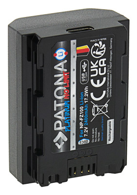 Batteria Patona Platinum compatibile Sony NP-FZ100 con ingresso USB-C per la ricarica diretta. La confezione include il cavo di ricarica.