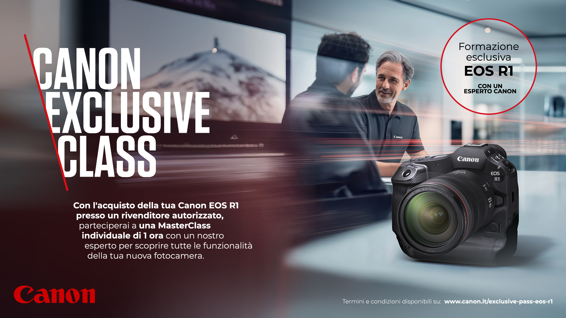 Acquista EOS R1 entro il 31/12/2025 e avrai diritto ad consulenza tecnica privata online o in presenza presso il Canon Customer Experience Center di Cernusco sul Naviglio (MI). Un'ora di formazione avanzata riservata solo ai nuovi possessori dell'ammiraglia di casa Canon.