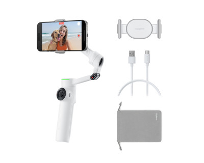 Pack standard: include Insta360 Flow 2 Pro (bianco), morsetto magnetico per smartphone, cavo di ricarica da USB-C a USB-A e custodia protettiva.