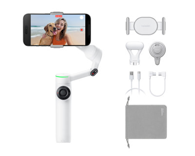 Pack Creator: include Insta360 Flow 2 Pro (bianco), morsetto magnetico per smartphone, supporto magnetico per smartphone, spotlight, cavo di ricarica da USB-C a USB-A, cavo di ricarica da USB-C a USB-C e custodia protettiva.