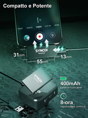 Il ricevitore piccolo e leggero inizia a funzionare ogni volta che viene collegato al dispositivo mentre il trasmettitore è dotato di una batteria ricaricabile da 400 mAh per 8 ore di registrazione continua.