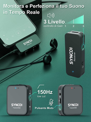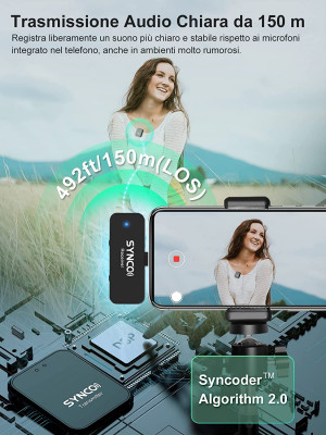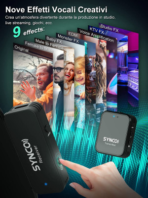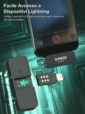 Microfono Wireless per iPhone e Android USB-C, SYNCO G1TL Lightning [Certificato Apple MFi] 2.4GHz Micro Lavalier Senza Fili con 9 Effetti Vocali, Microfono-Lavalier-Wireless-iPad-iPhone 13/12/11