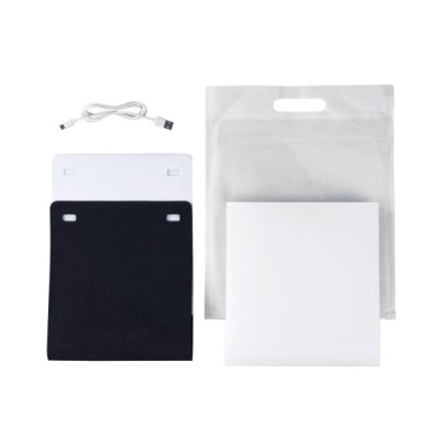 1x scatola luminosa con 2 strisce a LED, 1x sfondo bianco, 1x sfondo nero, 1x cavo USB, 1x coperchio antipolvere.