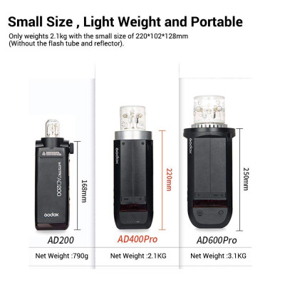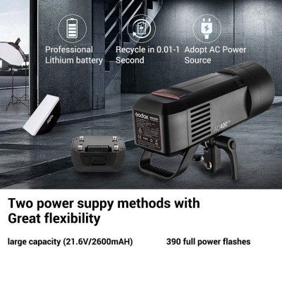 Dotato di un sistema X wireless a 2,4 GHz con distanza fino a 100 metri, l’AD400Pro Witstro All-In-One Outdoor Flash di Godox è uno strumento versatile compatibile con diversi sistemi TTL tra cui Canon, Nikon, Sony, Fujifilm, Olympus e Panasonic. Offre fino a 400W con nove livelli di potenza in uscita, da 1/1 a 1/256, ed è dotato di un potente pacco batteria agli ioni di litio da 28,8 V / 2600 mAh che fornisce fino a 360 flashate a piena potenza in situazioni e luoghi all’aperto. In alternativa, è possibile eseguire il monolight su alimentazione CA con un adattatore opzionale.