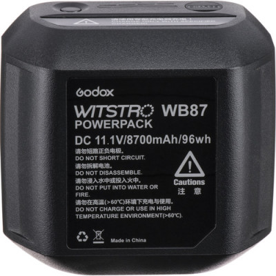 La batteria ricaricabile WB87 per la serie flash AD600 della Godox è una fonte di alimentazione al litio da 11,1V, 8700mAh compatibile con la serie flash Wistro AD600, AD600B, AD600M e AD600BM marchiati Godox. Una batteria completamente carica darà 500 flash a piena potenza.