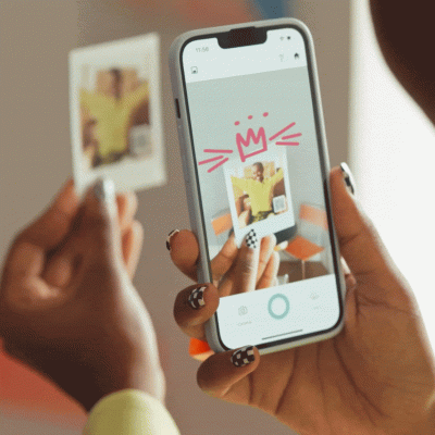 Stampante bluetooth per smartphone con AR Print, funzionalità che permette di aggiungere effetti speciali in realtà aumentata, visibili inquadrando il QR code della foto.