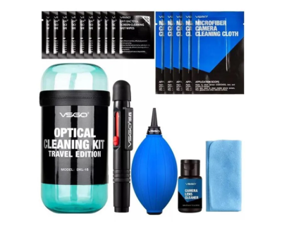 Questo kit VSGO comprende i prodotti necessari alla pulizia di fotocamera e ottiche in una pratica confezione da viaggio.
