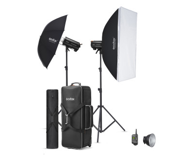 2 torce QT400 III M, stativi, parabola, trasmettitore, softbox, ombrello, borse per il trasporto.