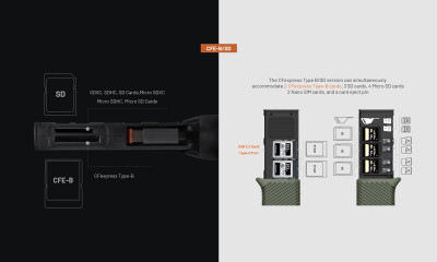 - Design con doppio slot per schede CFexpress B e SD, l'interfaccia Type-C supporta il plug-and-play