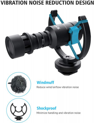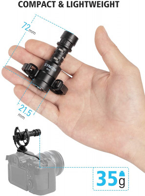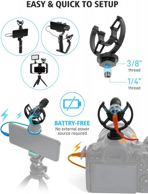 Il design ad assorbimento degli urti trasferisce le vibrazioni su i 4 anelli di gomma, consentendo al microfono di ridurre al minimo i rumori risultanti. Le dimensioni ultracompatte, 72 mm di lunghezza e 35 g di peso, gli consentono di stare comodamente sulla fotocamera e anche sui dispositivi mobili più piccoli.
