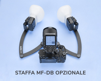 MF12-DK1 include gli accessori necessari per la fotografia dentale, risparmiando tempo ed energia per iniziare. Con una speciale attenzione alla compatibilità senza soluzione di continuità tra gli accessori, questo kit consente una maggiore efficienza e praticità durante le riprese di fotografia dentale. Due flash macro, un anello per l'aggancio degli stessi direttamente sull'obiettivo o due piccoli stand per posizionarli su una superficie. È incluso anche il trasmettitore XproIIS+, progettato appositamente per la fotografia dentale e compatibile esclusivamente con fotocamere e obiettivi Sony; questo trigger flash dentale è dotato di una modalità dedicata che migliora significativamente il flusso di lavoro adattando rapidamente le impostazioni del flash sulla fotocamera e garantendo un segnale più stabile, con interferenze ridotte al minimo.
