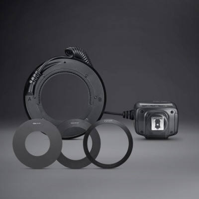 Grazie all'ampia gamma di adattatori in dotazione il ML-150 II è compatibile con gli obiettivi dal diametro di 49, 52, 55, 58, 62, 67, 72 e 77 mm. L'unità di controllo sulla slitta a contatto caldo è compatibile con quasi tutte le fotocamere.
