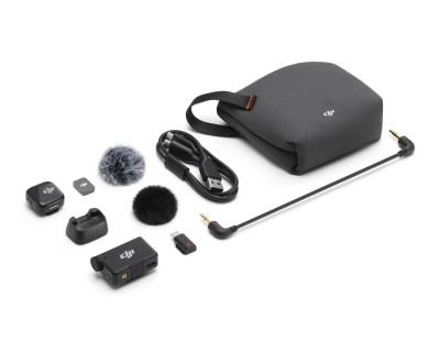 Kit trasmettitore + ricevitore. Inclusi nella confezione anche dock di ricarica, 2 paraventi, adattatore USB-C, cavo di ricarica, clip magnetico e custodia compatta per il trasporto.