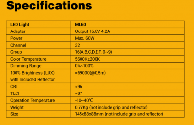 L’ML60 si oscura da 0 a 100% e dispone di un ricevitore a 32 canali e 16 gruppi che consente di regolare il livello di attenuazione della luce e le funzioni di accensione/spegnimento. È possibile gestirli localmente sul led o in modalità wireless a distanza con un controller acquistato separatamente. La luce ha anche otto effetti di luce tra cui fulmine, flash, conferenza, paparazzi, TV e lampadina rotta.