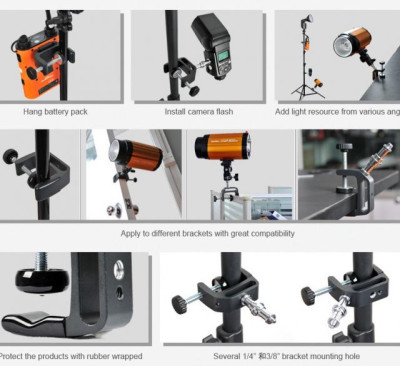 Il morsetto Godox Q type è dotato di fori per staffe da 1/4 e 3/8 e può essere regolato da 3mm a 45mm, perfetto per la maggior parte degli stativi.