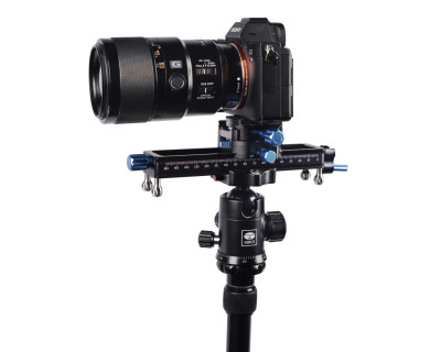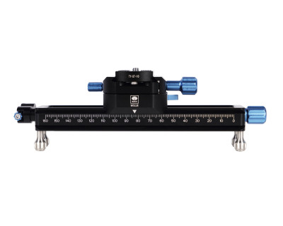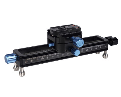 Costruzione solida in alluminio. La piastra inferiore cava riduce ulteriormente il peso del binario a soli 440 g. Questa guida di messa a fuoco può supportare combinazioni di fotocamera e obiettivo fino a 10 kg ed ha una corsa di 170 mm. Su entrambi i lati del binario sono presenti indici incisi per regolazioni fini.