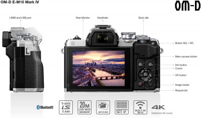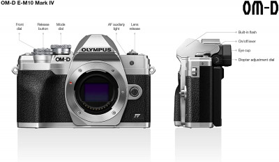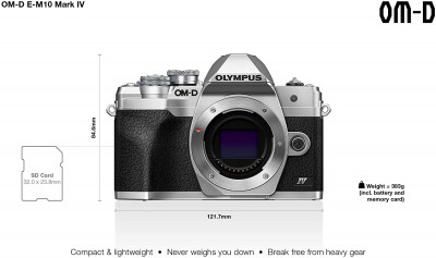 Olympus OM-D E‑M10 Mark IV. Tipologia fotocamera: Corpo MILC, Megapixel: 20,3 MP, Dimensione del sensore di immagine: 4/3", Tipo sensore: Live MOS, Risoluzione massima immagine: 5184 x 3888 Pixel. Sensibilità ISO (max): 25600. Velocità massima dell'otturatore della fotocamera: 1/16000 s. Wi-Fi. Tipologia HD: 4K Ultra HD, Risoluzione massima video: 3840 x 3160 Pixel. Dimensioni schermo: 7,62 cm (3"), Touch screen. Tipo di mirino: Elettronico. Peso: 383 g. Colore del prodotto: Silver