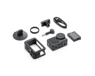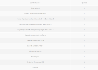 Osmo Action 3, batteria Extreme, cornice di protezione orizzontale-verticale, 2 protezioni in gomma per l'obiettivo, supporto per adattatore a sgancio rapido, supporto adesivo piatto, vite di bloccaggio, cavo PD da USB-C a USB-C, 2 adesivi con logo DJI, guida rapida.