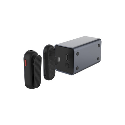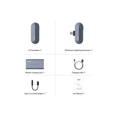 Il P1L comprende un trasmettitore a clip piccolo e leggero con il suo microfono omnidirezionale integrato e un ricevitore compatto con un connettore Lightning che si collega direttamente al tuo iPhone. Un jack da 3,5 mm sul ricevitore ti consente di collegare le cuffie per il monitoraggio mentre stai registrando. È incluso il cavo di ricarica USB necessario per il trasmettitore e una custodia di ricarica con batteria integrata che consente di riporre e ricaricare i componenti.