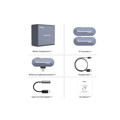 Il sistema utilizza uno schema di trasmissione Syncoder Encrypted Transmission Algorithm (FHSS) per garantire un funzionamento affidabile con un suono chiaro a una distanza in linea di vista fino a 492'. Le batterie ricaricabili integrate dei trasmettitori forniscono fino a 5 ore di funzionamento e si ricaricano tramite la porta USB di tipo C. Il ricevitore è alimentato dal tuo iPhone e non necessita di batteria per funzionare. Quando il ricevitore è collegato al telefono, la porta USB di tipo C del ricevitore consente di ricaricare il telefono durante l'uso, consentendo di registrare per numerose ore su un alimentatore USB o indefinitamente, se si dispone dell'accesso all'alimentazione CA.