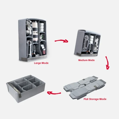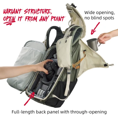 Questo zaino è dotato di un inserto fotografico interno pieghevole brevettato che offre una funzione di "espansione e contrazione". Per la fotografia all'aperto, con l'inserto interno in modalità ridotta, lo zaino è in grado di ospitare metà attrezzatura fotografica e metà attrezzatura per l'outdoor. A pieno carico, diventa una borsa fotografica ad alta capacità mentre senza inserto fotografico diviene un ottimo zaino per outdoor. Infine, l'inserto si comprime fino a raggiungere uno spessore di soli 2 cm, rendendolo facile da riporre senza occupare spazio. Adotta un rivestimento idrorepellente di teflon ed il pannello posteriore è realizzato in PVC impermeabile, proteggendo efficacemente la fotocamera e tutta la tua attrezzatura.