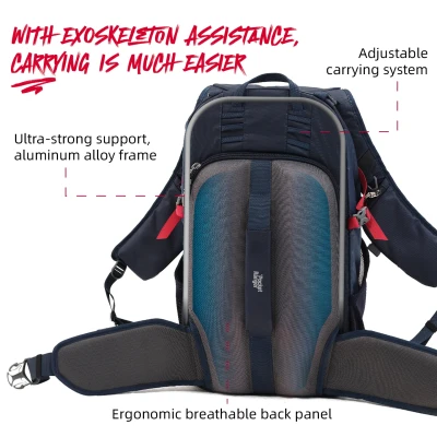 La struttura esterna dell'esoscheletro fornisce un forte sostegno e distribuisce la pressione, consentendo di muoversi agilmente anche quando si è completamente carichi di attrezzatura. Il pannello posteriore inoltre è dotato di un eccezionale supporto di lega di alluminio ultraleggero, che mantiene la sua forma indipendentemente dal carico.