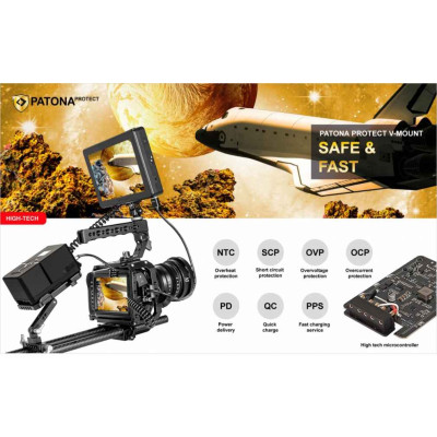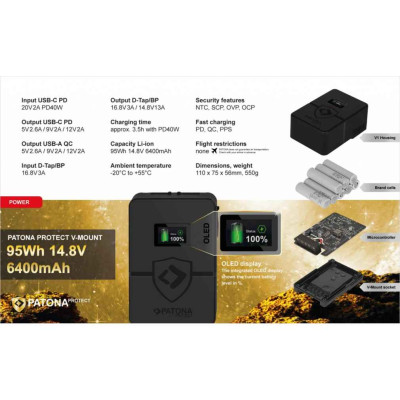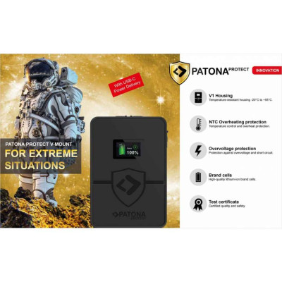 Batteria V-Mount PROTECT con celle Samsung in un alloggiamento ignifugo ed estremamente resistente al calore. È stato sviluppato appositamente per un uso continuo estremo. L'alloggiamento della batteria in materiale V1 può resistere a temperature fino a 90 gradi senza deformarsi. La serie PATONA PROTECT è la nuova rivoluzione nel mercato delle batterie, che combina sicurezza e prestazioni estremamente elevate con una lunga durata. Sulla scheda elettronica della batteria sono fissate resistenze NTC (coefficiente di temperatura negativo), che in caso di surriscaldamento si spengono automaticamente. Come ulteriore punto di forza, questa batteria ha un ingresso USB-C 40W-PD. Puoi raggiungere una carica completa in un tempo di 3,5 ore. Il display OLED integrato mostra il livello attuale della batteria in %.