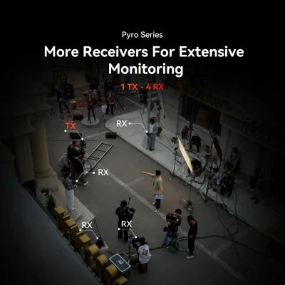 Grazie alla tecnologia WifiBroadcast di Pyro S, un solo trasmettitore può connettersi a quattro ricevitori con segnali stabili, offrendo maggiore flessibilità quando emergono esigenze di monitoraggio aggiuntive sul set. Attivando la modalità Broadcast, il trasmettitore può inviare segnali a un massimo di quattro ricevitori, raggiungendo una distanza di 200m. Quando la modalità Broadcast è disattivata, il trasmettitore può inviare segnali a un massimo di due ricevitori e due dispositivi mobili, con una distanza estesa fino a 400m.