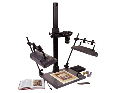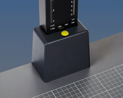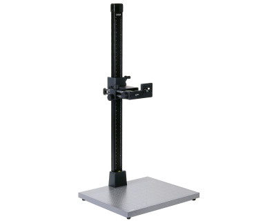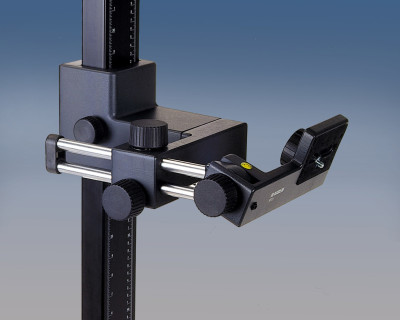 Supporto repro con ampia base grigia opaca antiriflesso e griglia stampata, scala in cm e pollici. Piedini regolabili in altezza, livella a bolla d'aria nella base della colonna. Ampia colonna in tubo di alluminio anodizzato nero opaco con scala in cm e pollici a bassa vibrazione. La regolazione dell'altezza avviene mediante cremagliera con compensazione del peso supplementare tramite molla elicoidale integrata e vite di bloccaggio che ne impedisce i movimenti accidentali. La colonna può essere montata ruotata di 180°.