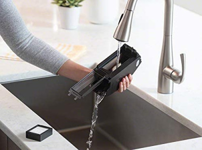 Basta premere un pulsante per sganciare il contenitore raccogli-polvere dal corpo del robot. Dopo aver rimosso il filtro High Efficiency, è possibile lavarlo sotto l'acqua per rimuovere anche la polvere più fine che si accumula negli angoli.