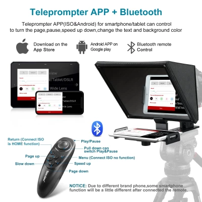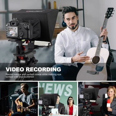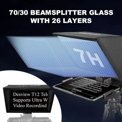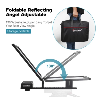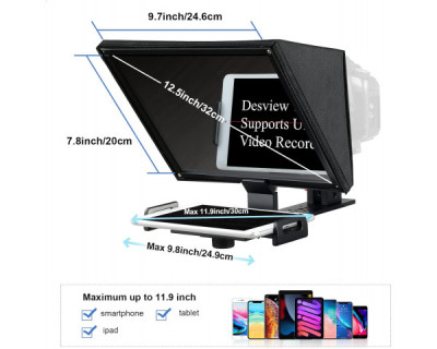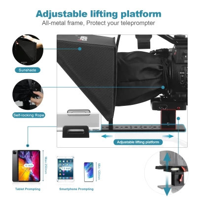 Il Teleprompter Desview T12 è progettato per i creatori di contenuti che utilizzano una fotocamera/videocamera Mirrorless/DSLR per evitare NG e migliorare l'efficienza durante la realizzazione di video. È dotato di un vetro di visualizzazione da 12,5" e di un resistente corpo in metallo, sollevabile con telecomando. Supporta le fotocamere Mirrorless e DSLR che registrano in verticale o in orizzontale e i tablet/smartphone con dimensioni inferiori a 11,9".