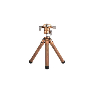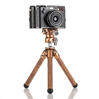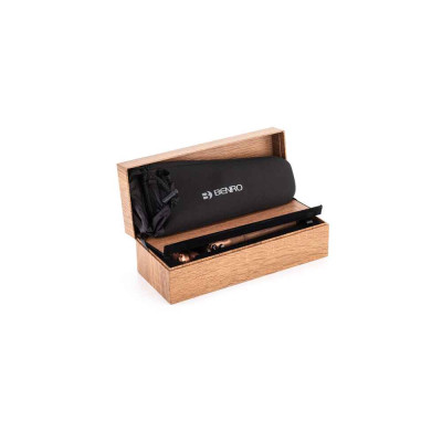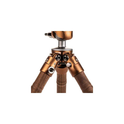 Treppiede da tavolo Benro modello Wood Edition che presenta parti in alluminio "bronzato", gambe in noce, in confezione regalo appositamente progettata.