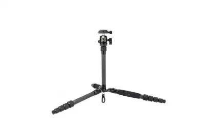Le gambe possono essere ruotate verso l’alto di 180 °, in modo che il treppiede sia alto solo 33 cm quando piegato (con la testa). Ogni gamba è composta da 5 sezioni con 4 chiusure ad anello sigillate. I piedini in gomma consentono al treppiede di stare saldamente su qualsiasi superficie.