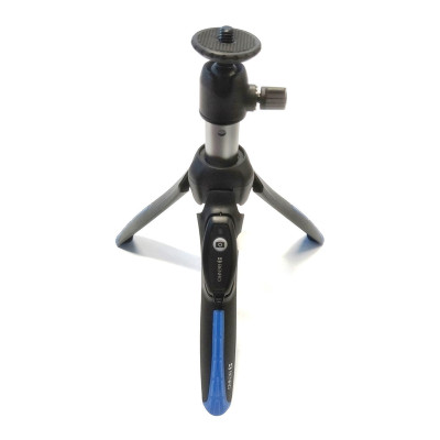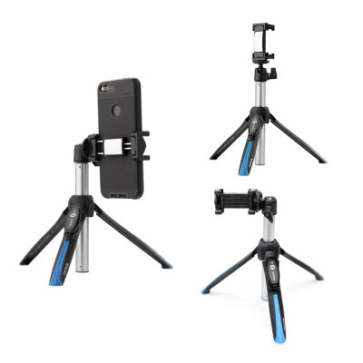 Mini treppiede con testa a sfera. Include un adattatore per smartphone e telecomando Bluetooth rimovibile. Compatibile con la maggior parte degli smartphone.
