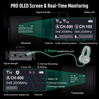 Il filtro passa-alto da 100Hz bypassa i rumori del vento, della corrente e del traffico. Il controllo del guadagno a 15 livelli si adatta a diversi input, dal parlato morbido al suono rimbombante. La batteria agli ioni di litio da 1300 mAh supporta il funzionamento continuo di 8,5 ore. Il caricabatterie rapido accetta una ricarica completa 3 in 1 (1RX + 2TX) in 3 ore. Tutto questo lo rende un microfono wireless professionale.