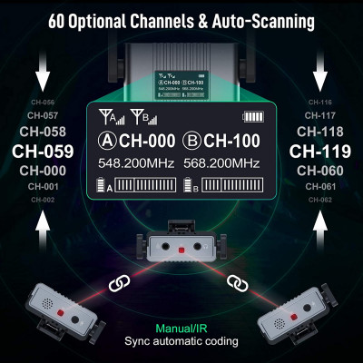 Il microfono wireless WMic-TS funziona con la banda UHF professionale SYNCO Wireless LinkLable che analizza e calcola i dati di frequenza in base al chip intelligente integrato per fornire il canale migliore e più pulito e per supportare i 492 piedi/150 m (linea di vista) o trasmissione da 262 piedi/80 m (non in linea di vista).