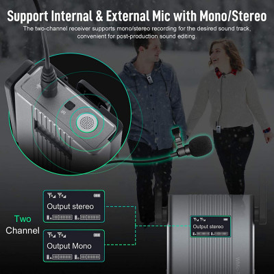Il sistema di microfoni lavalier wireless supporta la registrazione mono e stereo. In mono, i suoni di 2 trasmettitori sono combinati per ottenere un’unica uscita; in stereo, sono tenuti separatamente sul lato sinistro o destro per essere doppie uscite. Ciò consente di registrare 2 persone che parlano utilizzando 1 ricevitore ed elaborare ogni uscita in un secondo momento.