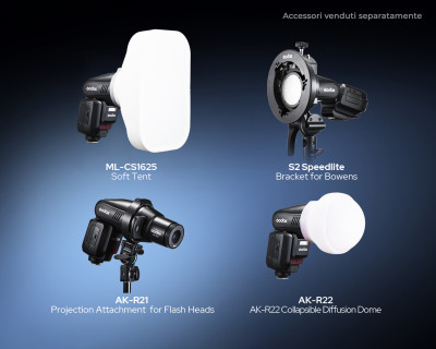 Questo flash, essendo dotato di trasmettitore e ricevitore del sistema Godox X a 2,4 GHz, può essere attivato e controllato da qualsiasi trasmettitore Godox X System. Può essere utilizzato anche come unità master per controllare altre luci. Inoltre, il facile accoppiamento one-touch consente una rapida integrazione con il trigger Godox X3 o con altre luci Godox. Il flash è compatibile con un'ampia gamma di modificatori e accessori del sistema Godox disponibili separatamente, tra cui il kit di accessori magnetici AK-R1, l'attacco di proiezioni AK-R21, il softbox a cupola AK-R22 o la staffa S2, che consente il montaggio di modificatori dotati di attacco Bowens.