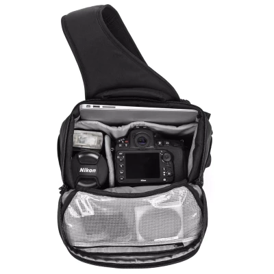 La serie Velocity di Tamrac ha un design unico che consente di trasportarli comodamente come zaini, ma non è necessario rimuoverli per accedere all'attrezzatura fotografica. Il Velocity 8z Photo Sling Pack è uno zaino a tracolla ultra funzionale progettato per una DSLR con un obiettivo zoom montato lungo fino a 20 cm, alcuni piccoli obiettivi aggiuntivi, un flash e accessori.