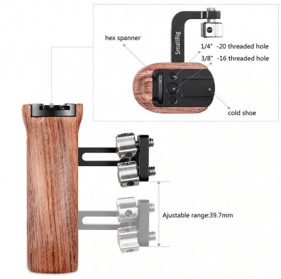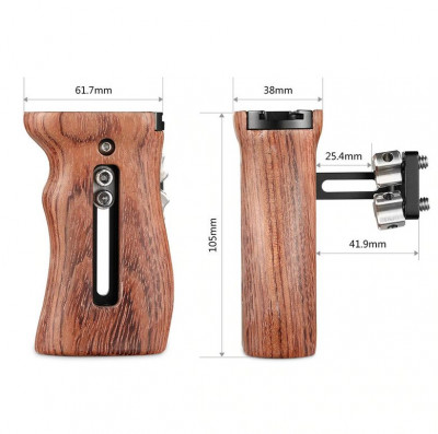 L’impugnatura laterale universale 2093 in legno SmallRig è progettata per fornire un comodo scatto manuale per i videomaker. È bloccata tramite due viti e si adatta a qualsiasi cage dotato di due fori filettati 1/4 ”-20 con distanza 18mm sul lato. L’impugnatura laterale ergonomica può essere fissata al lato sinistro o destro allentando le due viti sul lato per cambiare direzione. La chiave esagonale integrata è progettata per serrare nuovamente le viti a testa zigrinata e regolare rapidamente la posizione della maniglia. L’impugnatura in legno è in grado di adattarsi su e giù in base alle tue esigenze. Si integra con un unico pezzo in lega di alluminio che lo rende leggero e resistente, è in grado di adattarsi a tutti gli ambienti anche quando fa freddo.