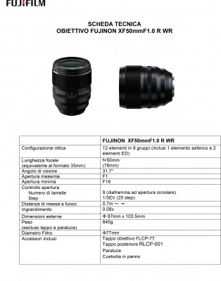 Il Fujifilm XF50mm F1.0 R WR è un obiettivo medio-tele per formato APS-C. La messa a fuoco con Stepper Motor include il riconoscimento di viso e occhi e il rilevamento di fase. Composto da 12 elementi suddivisi in 9 gruppi e contiene anche un elemento asferico e due elementi ED.