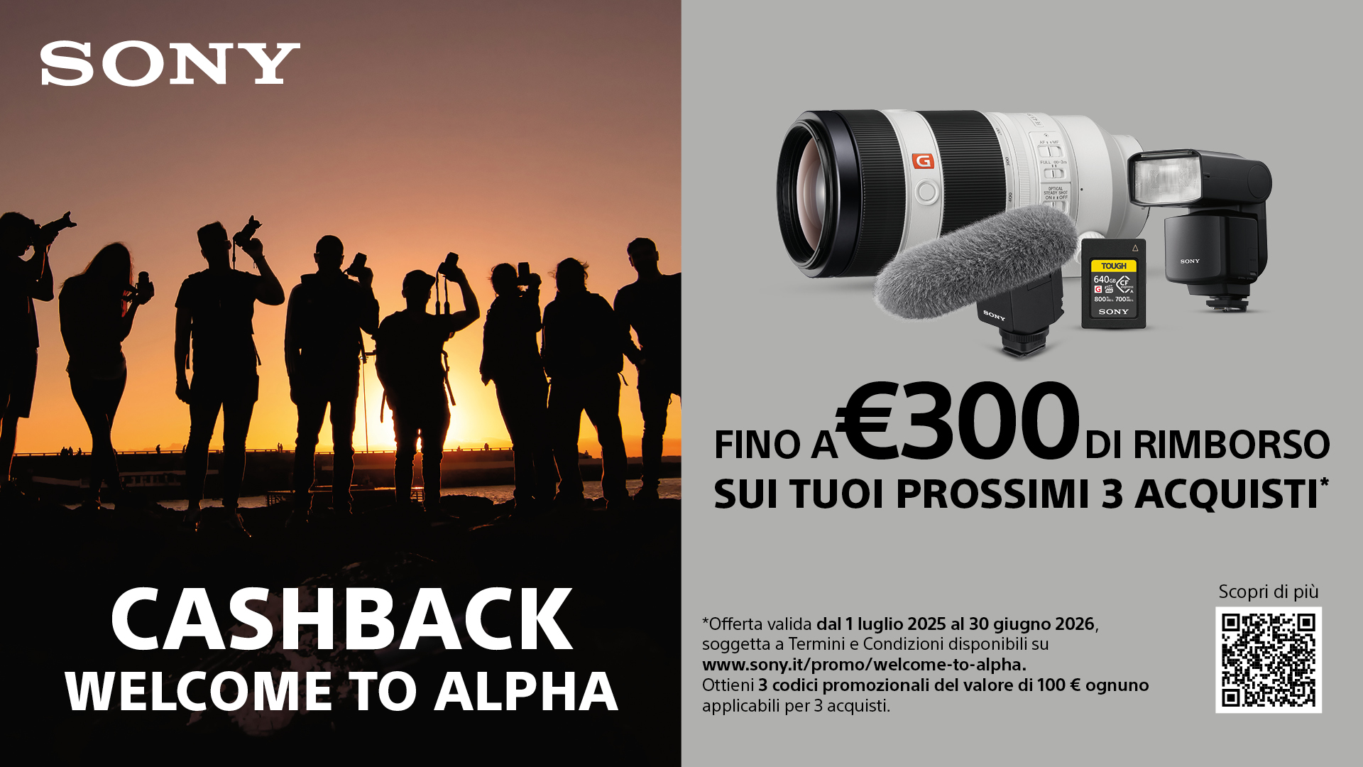 Registra la tua nuova mirrorless su My Sony entro il 30 giugno 2026 e ottieni 3 codici promozionali del valore di 100€ ciascuno per l'acquisto di altrettante ottiche, accessori o microfoni (fino ad un massimo di 3 in totale per ogni fotocamera registrata).