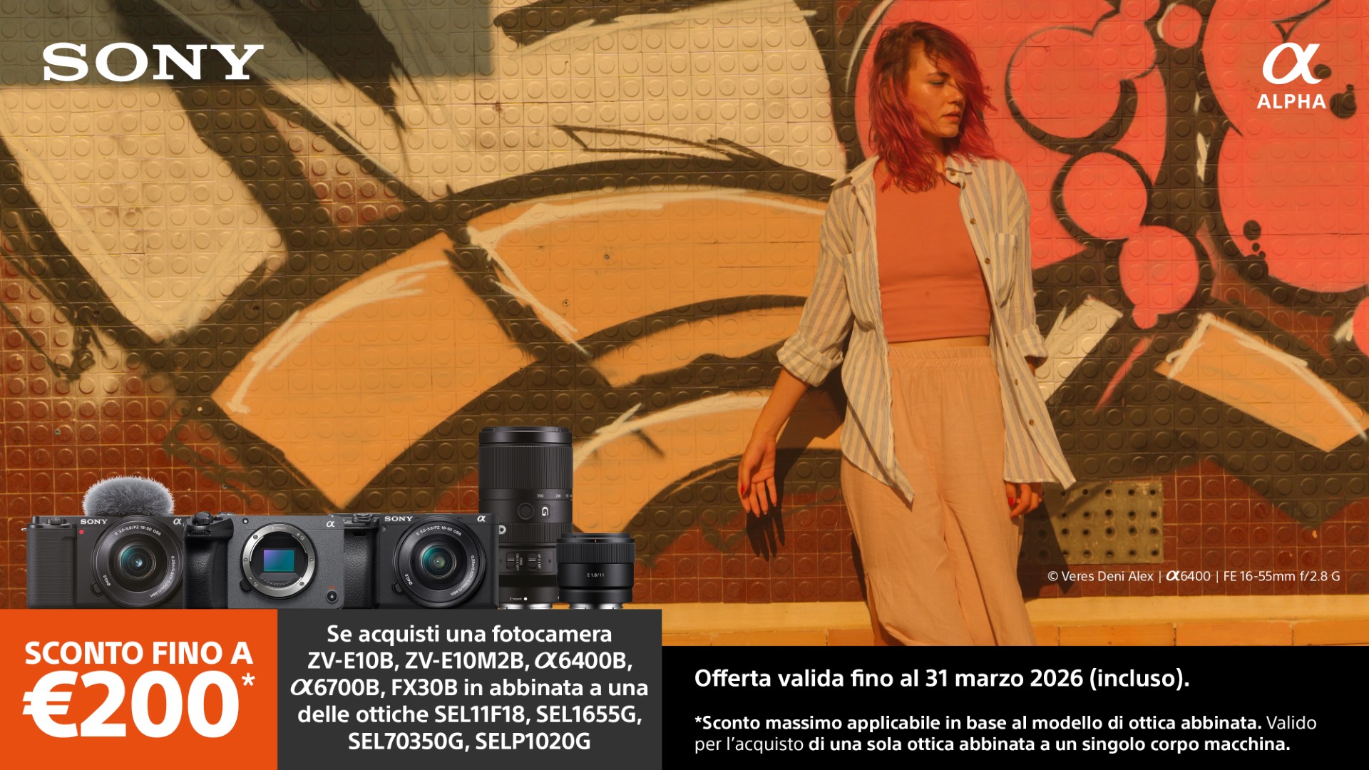 Acquista la versione body di FX30, A6700, A6400, ZV-E10 II e ZV-E10 insieme ad uno degli obiettivi selezionati e ricevi uno sconto immediato nel carrello. Iniziativa valida fino al 31 marzo 2026.