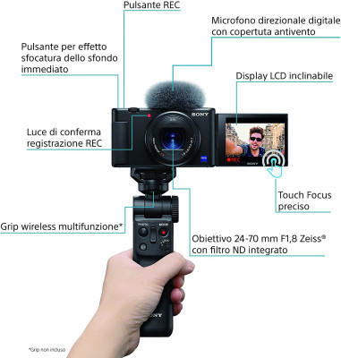 La VLog Camera ZV1 è progettata per la creazione di contenuti con uno schermo LCD ad angolazione variabile adatto ai selfie, impugnatura comoda e una spia di registrazione. Un microfono direzionale a 3 capsule con schermo antivento rileva la voce nitidamente, riducendo il rumore del vento; l'interruttore Bokeh e l'impostazione Product Showcase rendono i video più interessanti con il minimo sforzo.